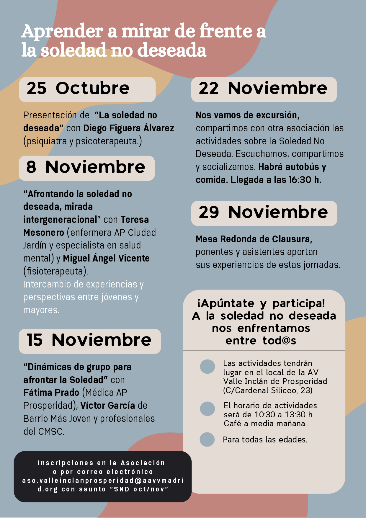 Desde la Asociación vecinal Valle Inclán de Prosperidad hemos organizado ” unas Jornadas sobre: “Aprender a Mirar de Frente la Soledad no Deseada” con el objetivo de visibilizar, compartir experiencias cuando nos encontramos en soledad y no sabemos cómo afrontarla