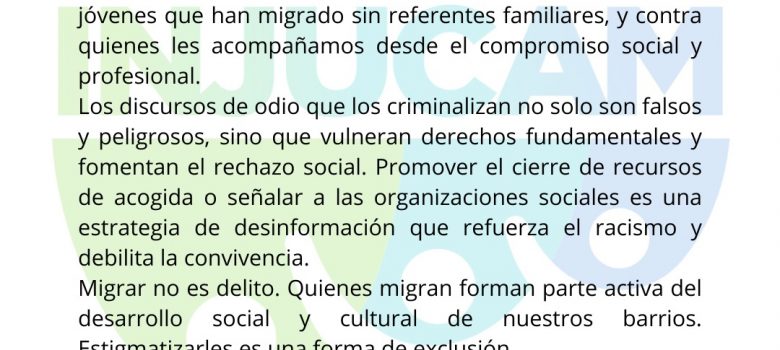 Migrar no es un delito. La juventud migrante enriquece nuestros barrios y merece protección, no persecución. Denunciamos los discursos de odio que criminalizan a quienes huyen de la violencia y la pobreza, y a quienes les acompañamos. La acogida es un derecho, y las entidades sociales somos parte de la…