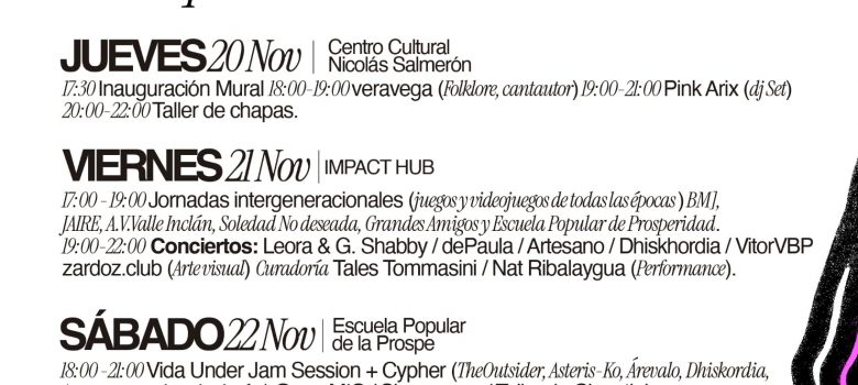 Del 20 al 23 de noviembre · Prosperidad, Madrid100% Gratis · Cultura joven, barrio y creatividad Prospe Not Death vuelve un año más con su cuarta edición para llenar el barrio de Prosperidad de arte urbano, música, comunidad y creación colectiva. Durante cuatro días, diferentes espacios del barrio se transforman…
